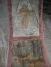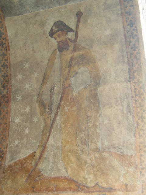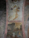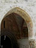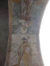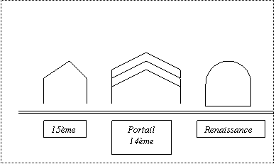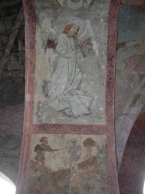 Un peu plus tard, le porche fut complété par deux porches latéraux couverts en charpente. A côté de la porte du XIII° siècle furent ouvertes une porte au Nord sans ornements et une au midi datée de 1564, plus élégante avec une arcade cintrée. Ce porche est formé de trois travées communiquant entre elles par deux arceaux en arc brisé. La voûte centrale est divisée en quatre compartiments triangulaires par des nervures à simple biseau et sa clef est ornée dun agneau portant la croix. Des peintures décorent lintrados des trois arceaux où lon voit quatre anges jouant de la guiterne, du violon et de la harpe, Saint Jean-Baptiste et Saint Jacques. Quatre panneaux sont peints, deux de chaque côté de la porte de léglise et deux autres en regard des premiers sur les parois intérieures des piliers. Ils représentent des personnages sauvés de divers dangers ; ces fresques sont des ex-voto. Sur le premier panneau à droite de la porte un homme est assis dans une prison les deux jambes prises dans deux anneaux ; il s'échappe tenant les fers dans ses mains et remercie, à genoux, devant un autel surmonté darcatures au milieu desquelles trône une statue de Notre-Dame de Pitié. La figure à genoux présente un grand caractère de réalité. Sous le second panneau à gauche de la porte un gentilhomme, en costume de lépoque de LOUIS XII, arrache un poignard à un assassin, il rentre dans son château dont la porte munie de la herse est défendue par deux tourelles rondes, il remercie devant le même autel. Vis-à-vis de ce panneau un troisième montre deux gentilshommes se battant en duel ; lépée de lun des combattants se retourne contre lui-même comme par un effet miraculeux ; lautre se met à genoux devant lautel. Enfin dans le quatrième panneau est représenté un ange de grande taille nimbé et jouant de la harpe, au-dessous de lui une femme tombe dun arbre la tête en bas, ses vêtements sont en désordre ; elle sagenouille avec un cierge dans la main droite devant Notre-Dame de Pitié. Tous ces tableaux sont encadrés par une bordure en plate-bande ocre rouge semée de rosettes noires. Les costumes, les armures, les physionomies, font dater ces peintures du XV° siècle. Dautres peintures à peine décelables, décoraient le mur du fond au-dessus de la porte de léglise et représentaient des scènes de la vie de la Vierge.
