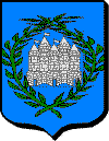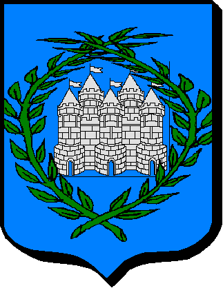 D'azur à un château d'argent environné de 2 branches de laurier de sinople